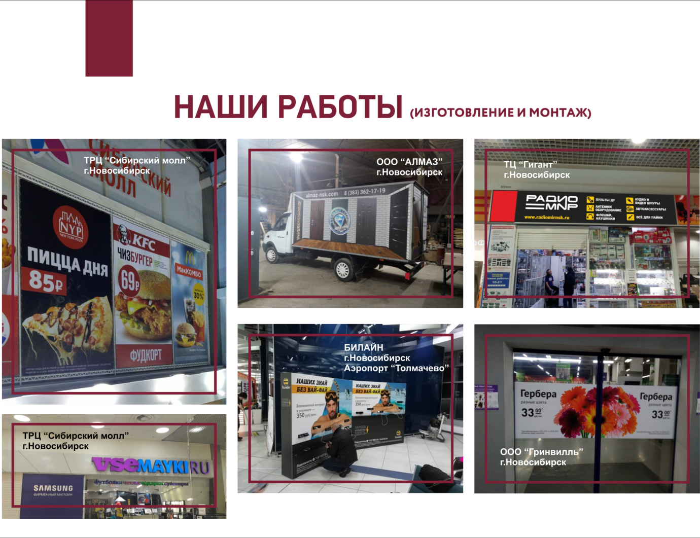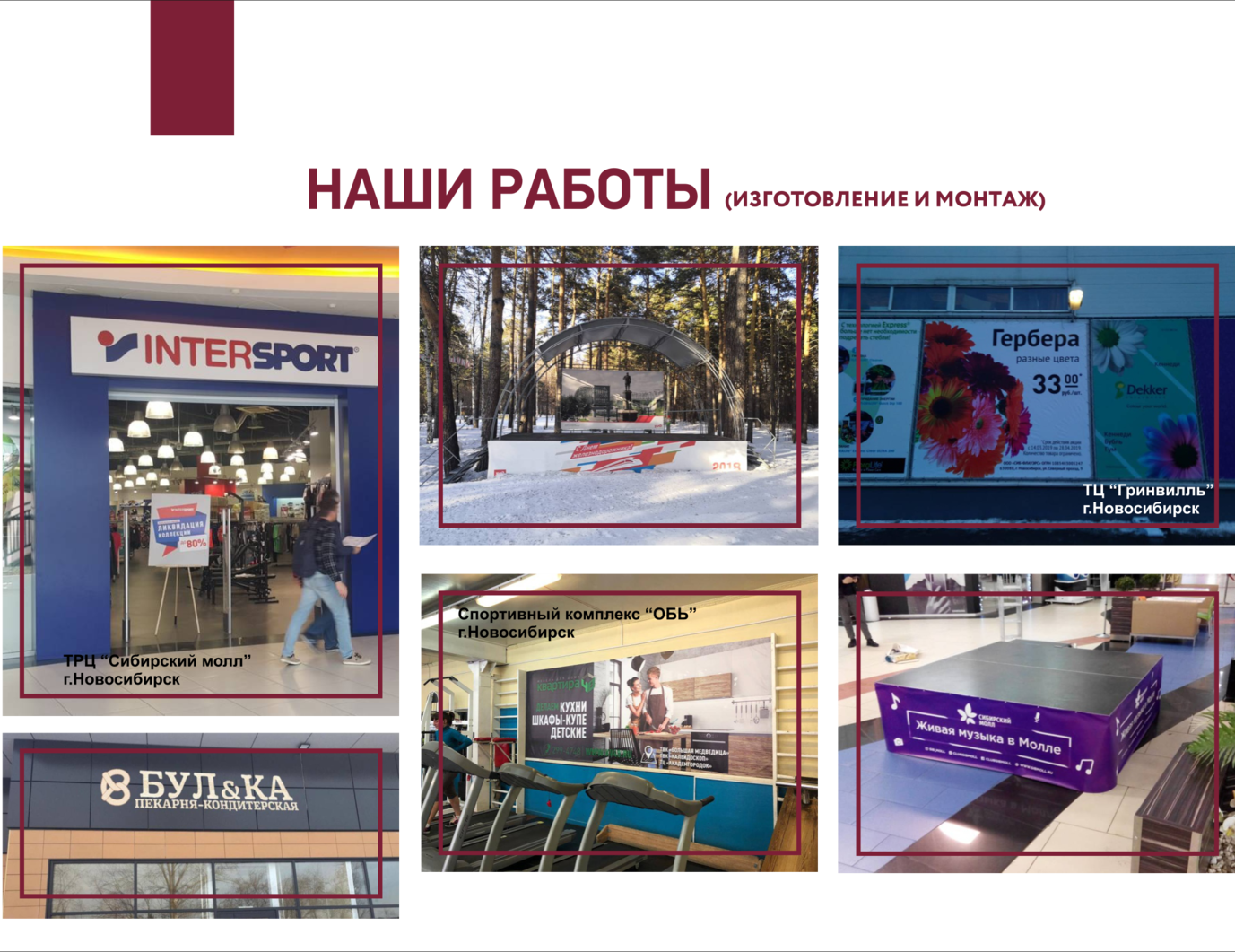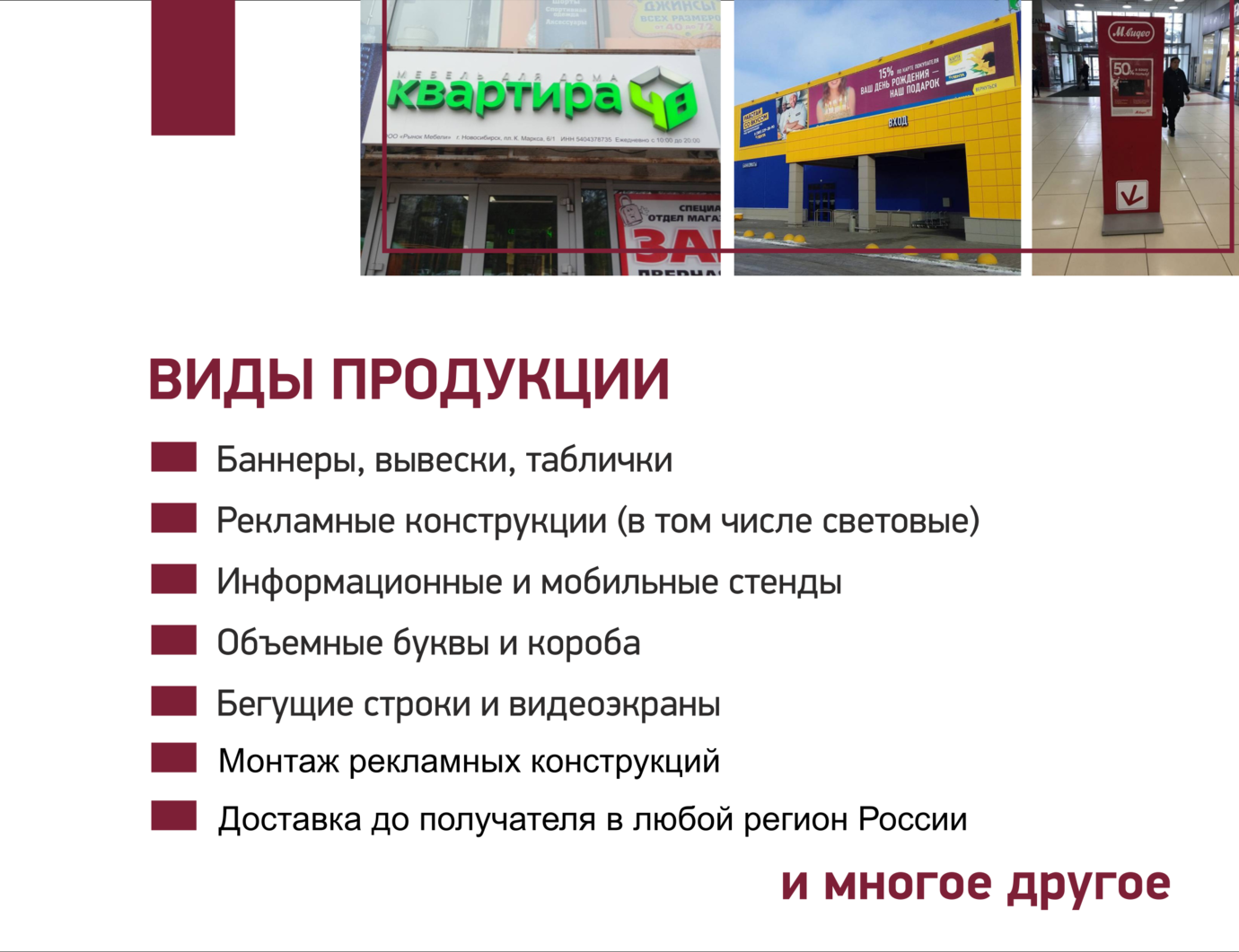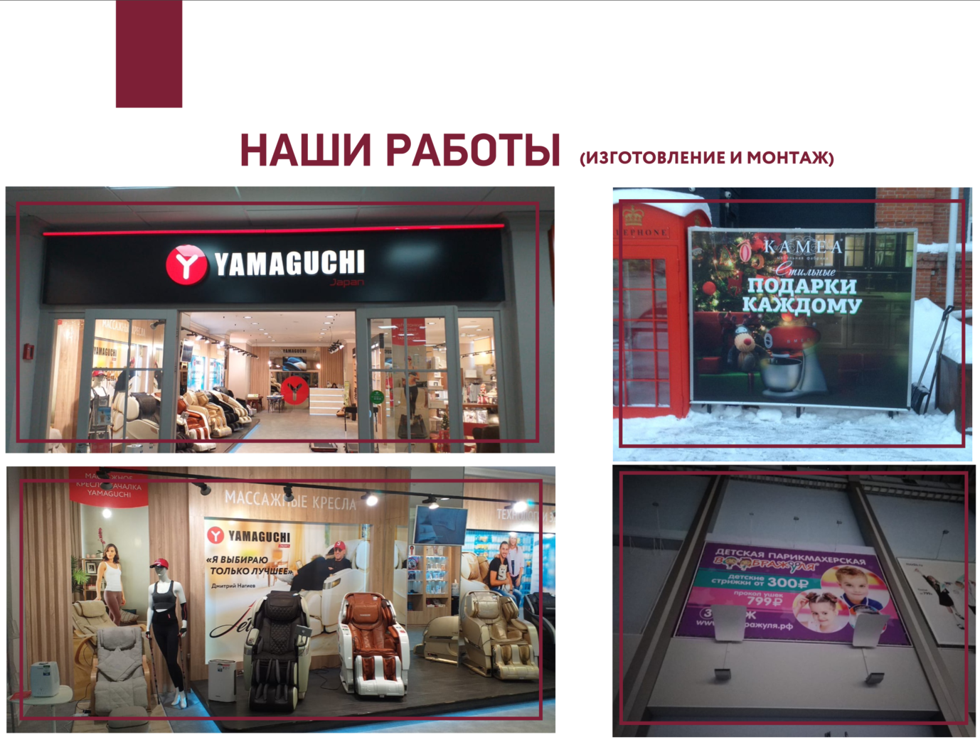 Для нас важно, чтобы дела наших рекламодателей шли хорошо, нам интересна не сиюминутная выгода, а долгосрочная совместная работа. Наша мастерская предоставляет практически весь спектр рекламных услуг и при комплексном обслуживании, заказчика ждет гибкая система скидок, возможность работы в кредит и т.д.